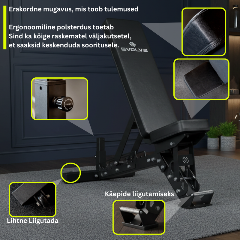 Reguleeritav treeningpink on iga eduka koduse jõusaali süda. Evolve Econ pakub profitaseme stabiilsust ja 9 erinevat asendit, et saaksid treenida kõiki lihasgruppe ilma järeleandmisteta.